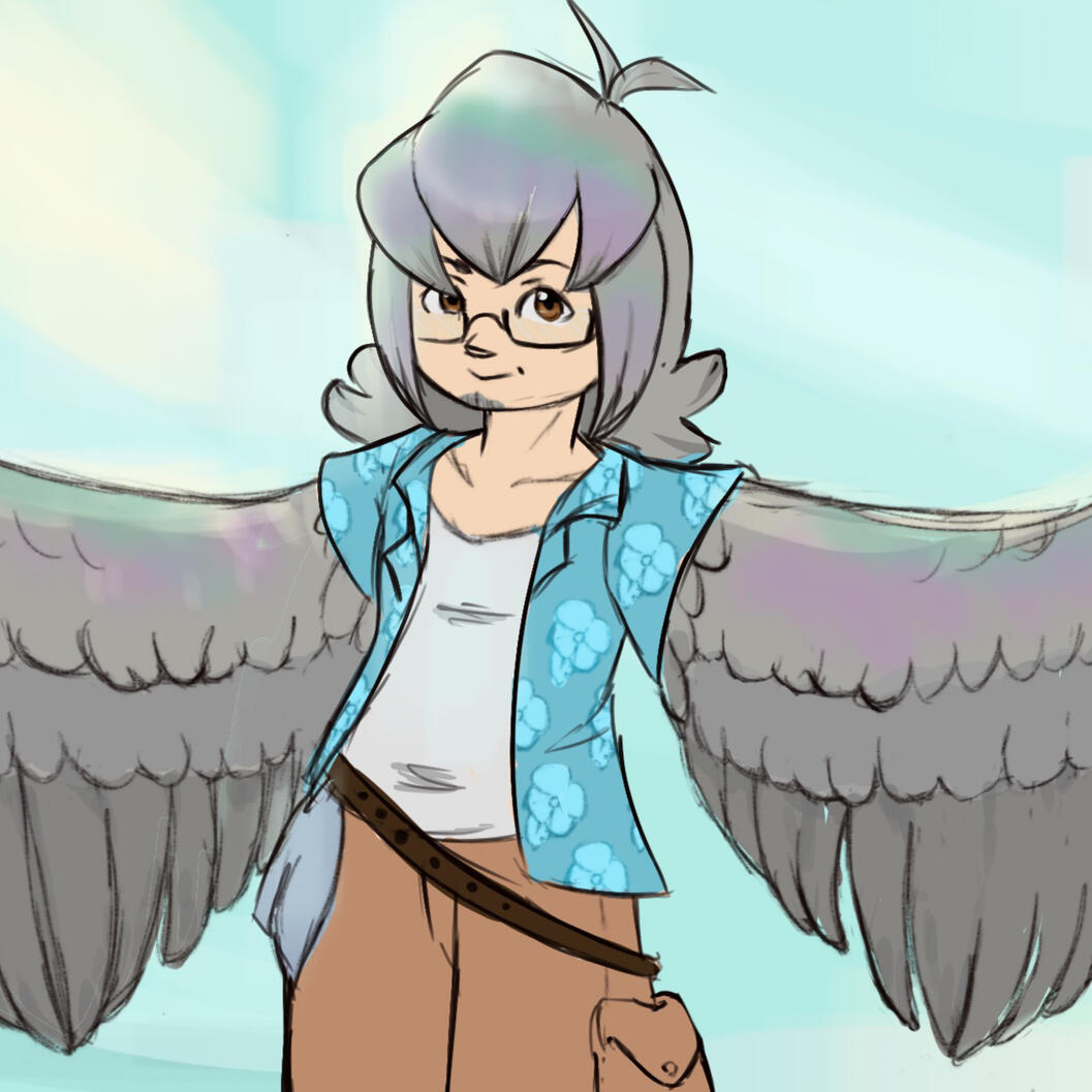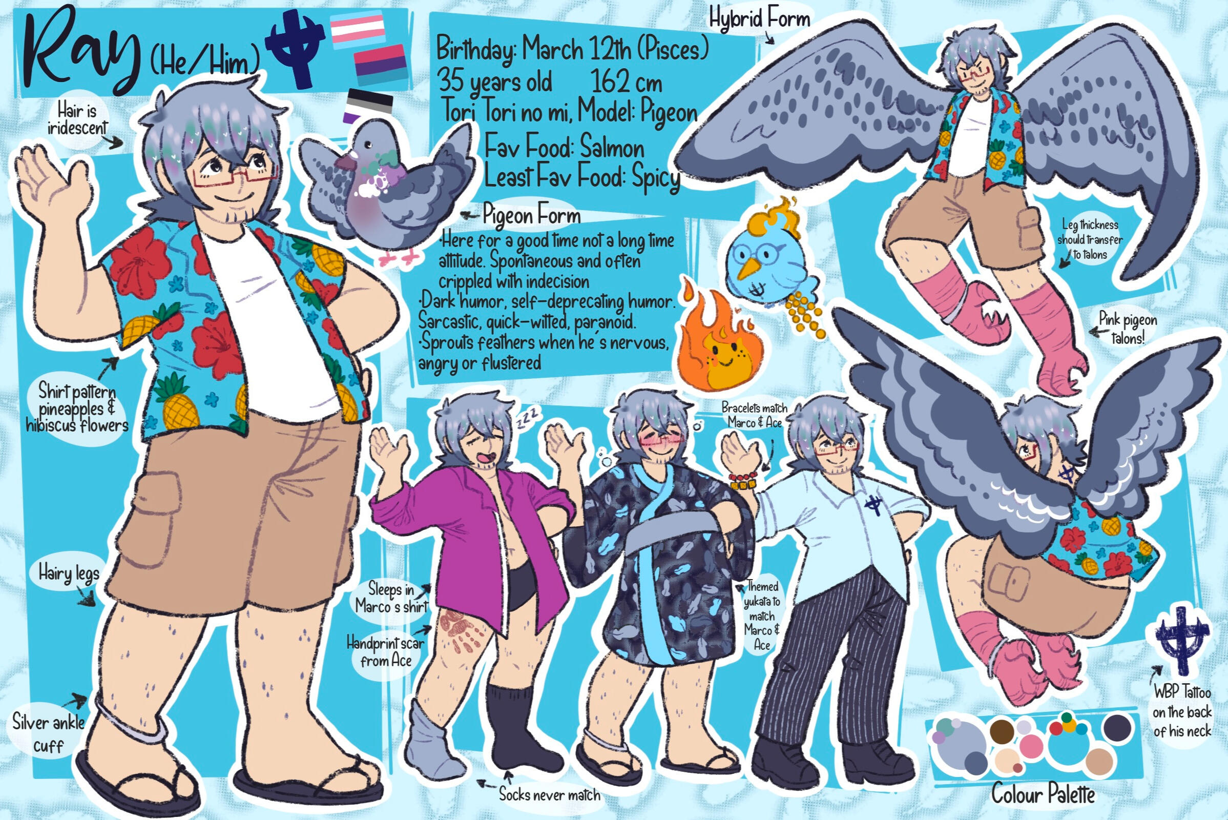 Ray is only 5'2, pear shaped, still has breasts but carefully binded. Wide hips, round brown eyes, chubby thighs and tummy. Messy grey hair that has iridescent purple/pink/green parts when the light hits it. Just like pigeons. He wears an ankle cuff made of silver one one ankle, sandles, white T-shirt or tank top under patterned shirts. Often loud and ugly. Black rectangle framed glasses.Looks like someone who is always on vacation but has a resting >/ face no matter how good of a mood he is in.His bird form is a female wood pigeon.His half and half form mostly has his tail, talons, huge wings but sometimes he had feathers along his arms because his thoughts jumble and he can’t relax enough to be fully wings or fully arms, he’s getting better at it.